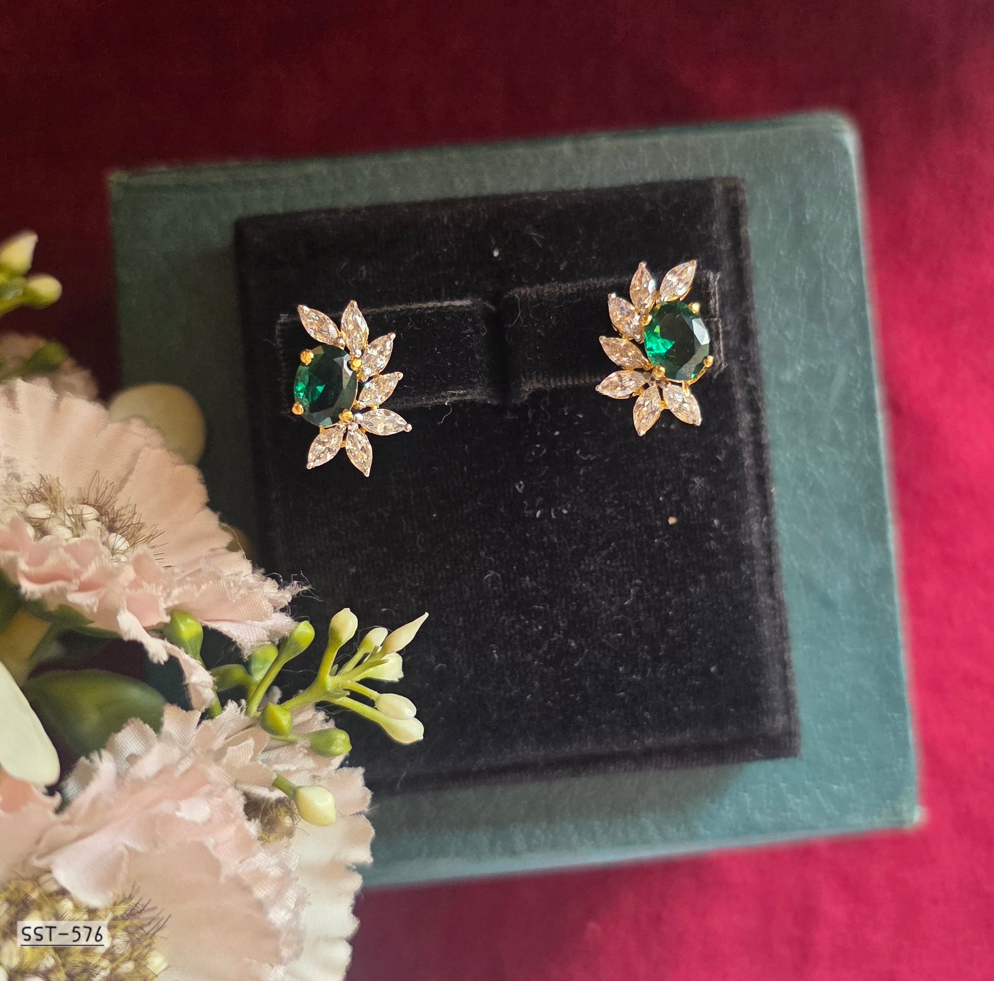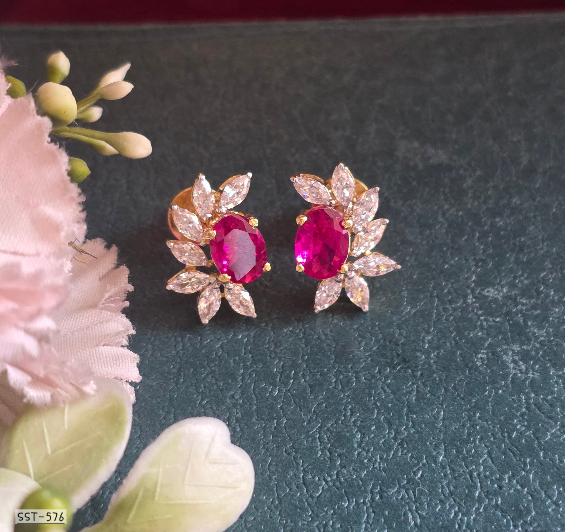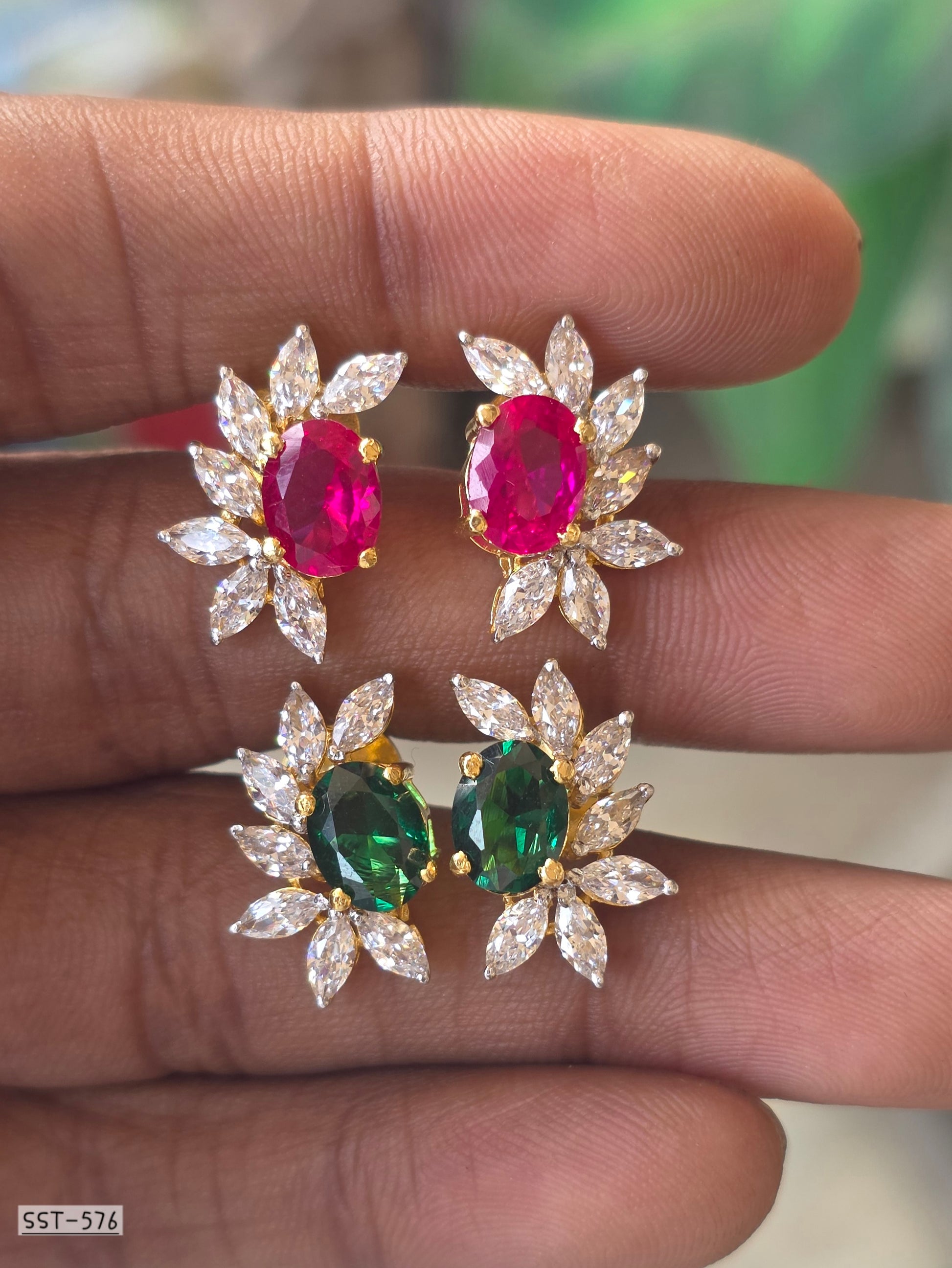 DESIGNED TO CAPTURE ATTENTION AND ELEVATE EVERY LOOK, THESE RADIANT BLOOM STUD EARRINGS FEATURE A VIBRANT OVAL CENTER STONE FRAMED BY A HALO OF MARQUISE-CUT SPARKLE, ARRANGED LIKE DELICATE PETALS IN FULL BLOOM. THE FLORAL-INSPIRED SILHOUETTE CREATES A PERFECT BALANCE OF CLASSIC CHARM AND MODERN GLAMOUR. IDEAL FOR SPECIAL OCCASIONS OR ADDING A LUXE TOUCH TO EVERYDAY STYLE, THESE EARRINGS ARE A TIMELESS STATEMENT FOR THOSE WHO LOVE REFINED ELEGANCE WITH A BOLD, UNFORGETTABLE PRESENCE.